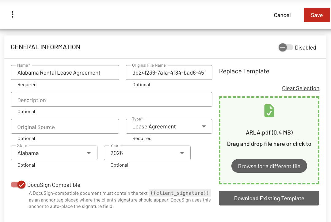 Once your PDF includes the proper anchor tags, upload the file, update the remaining template details, and click Save to apply your changes.