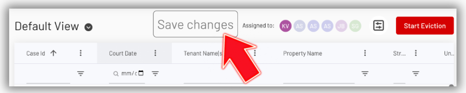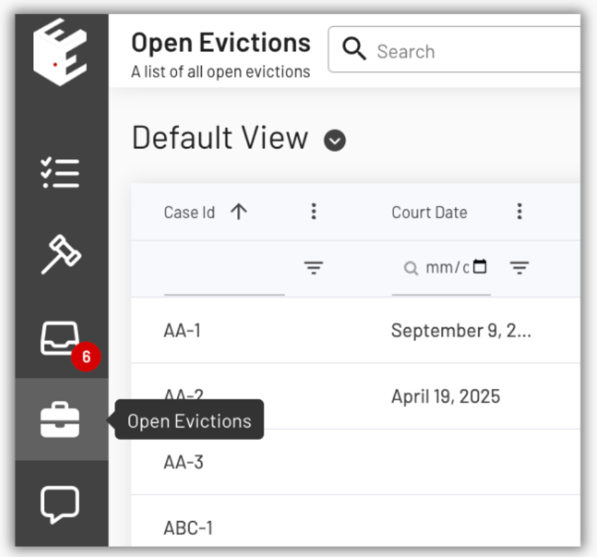 A customized view allows you to quickly return to a specific way of organizing your cases on the Open Evictions page. This is especially helpful when you have applied filters and want to save that layout for future use.