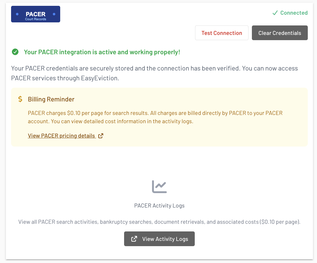 Easyeviction securely stores your PACER credentials to query bankruptcy records on your behalf.