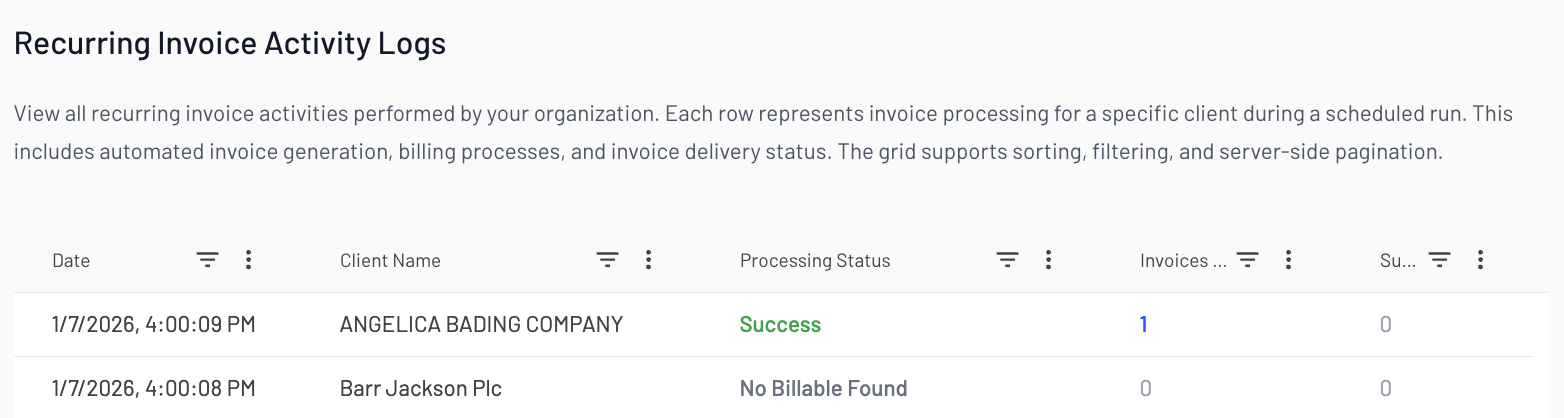 Each entry for client name, invoice number, and invoice details, providing a clear audit trail of automatically generated invoices.