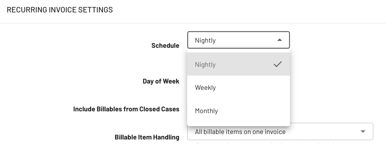 Choose how often invoices should be generated (e.g., nightly, weekly, or monthly) to ensure consistent and timely billing without manual intervention.