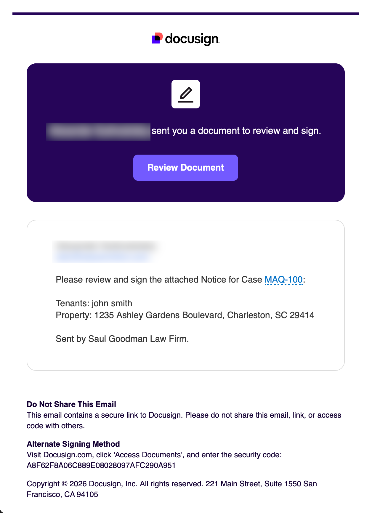 Pre-filled recipient (e.g., client, attorney, or tenant email).