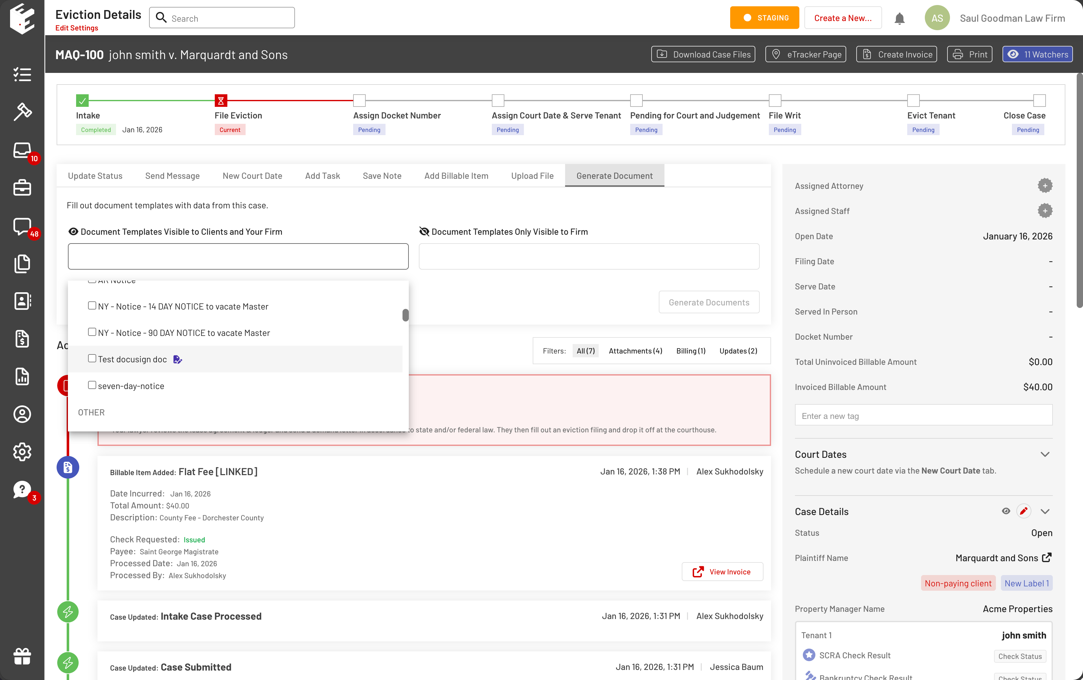 The new DocuSign integration allows you to seamlessly send generated documents for electronic signing directly from EasyEviction. This is ideal for notices, agreements, or any document requiring a signature.