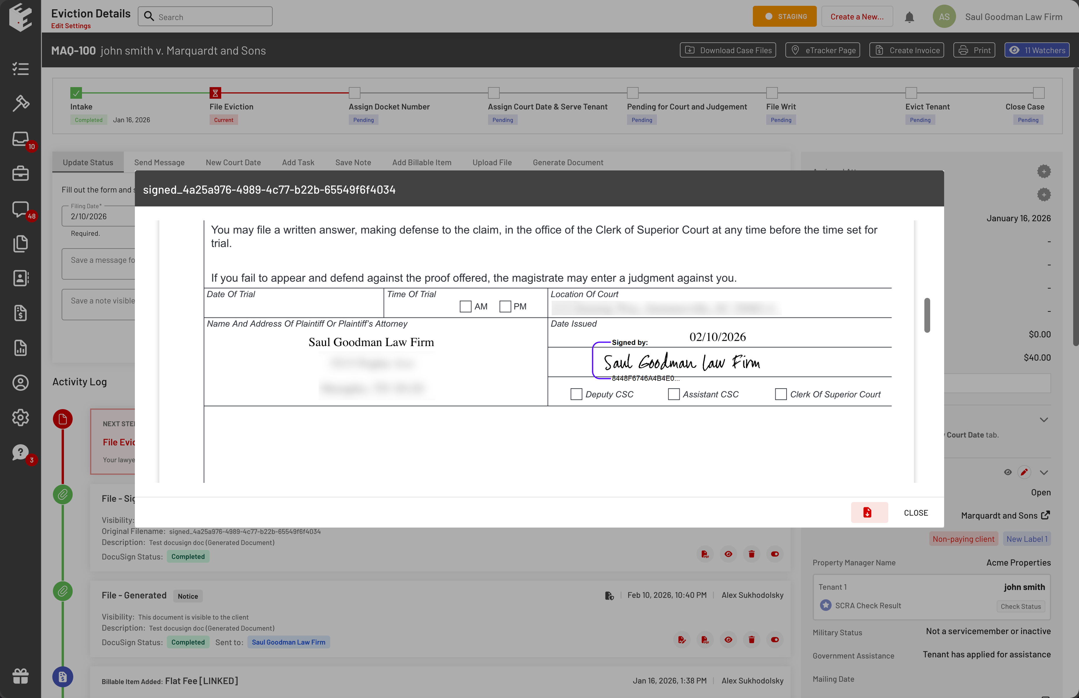 Click to preview any signed copy attachment to see the fully executed version with visible signatures. The signed PDF can be downloaded, shared with the client, or used in subsequent steps (e.g., filing the eviction).