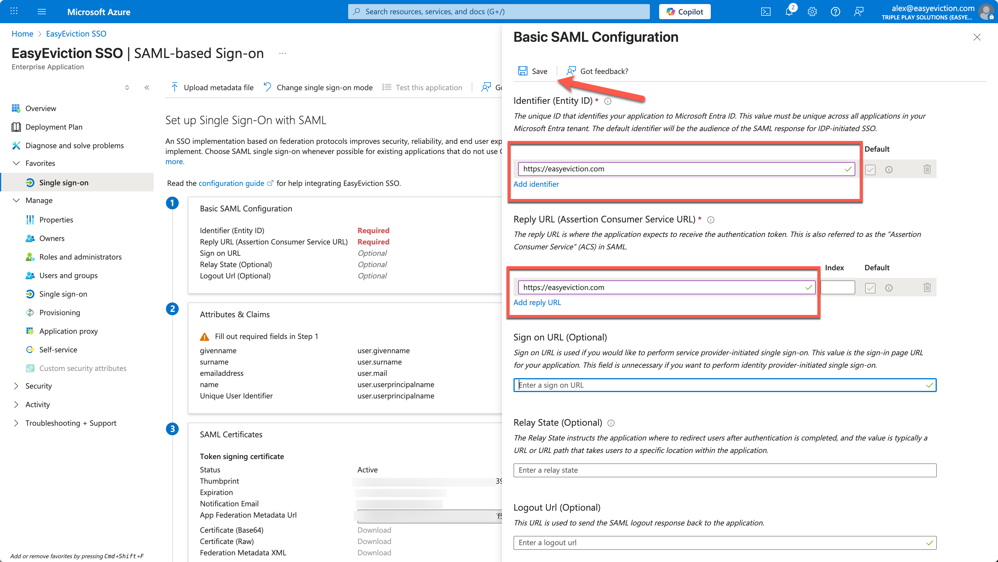 - Copy the values from the EasyEviction SSO Configuration page into the following fields: