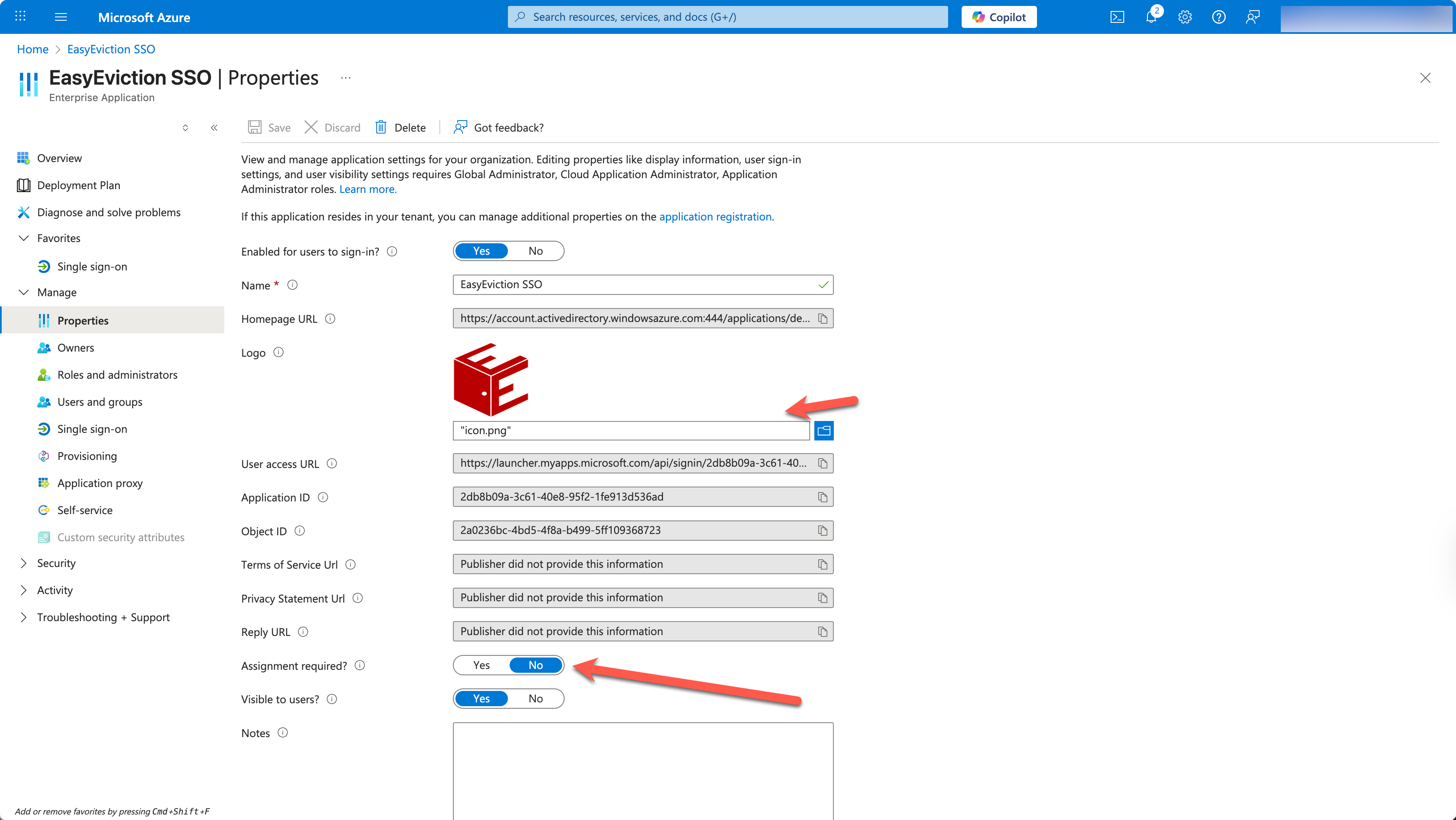 - Toggle the Assignment Required setting to No to ensure all users can access the site. Otherwise, you can assign users to this application to enable access individually.