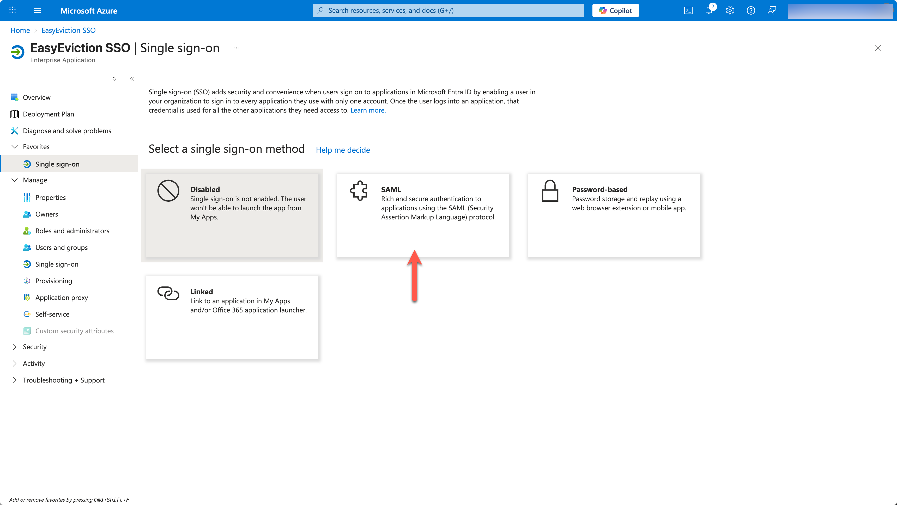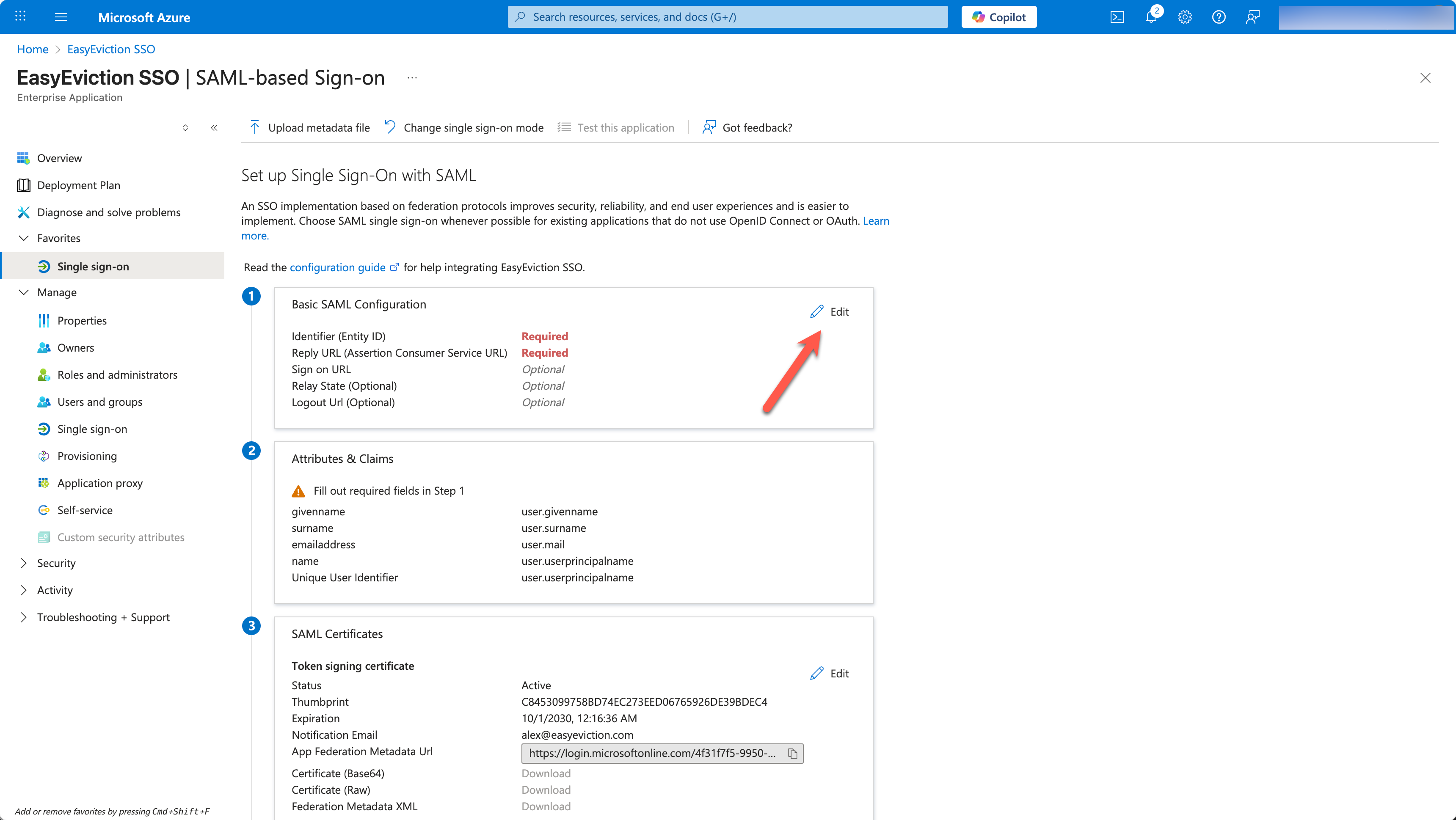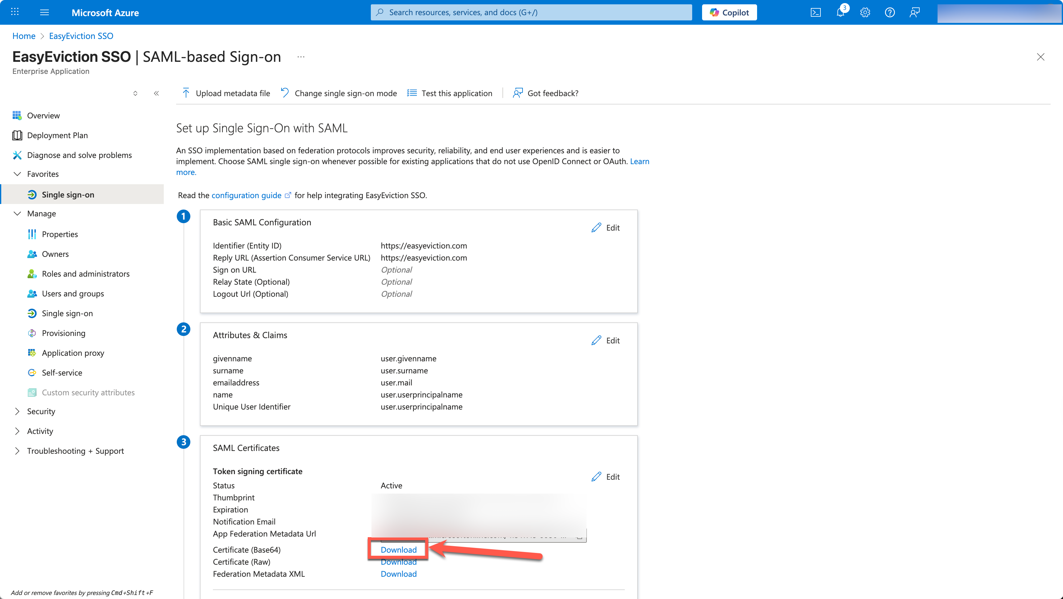 - Contact support@easyeviction.com with a screenshot of your Entra ID SAML configuration page.
